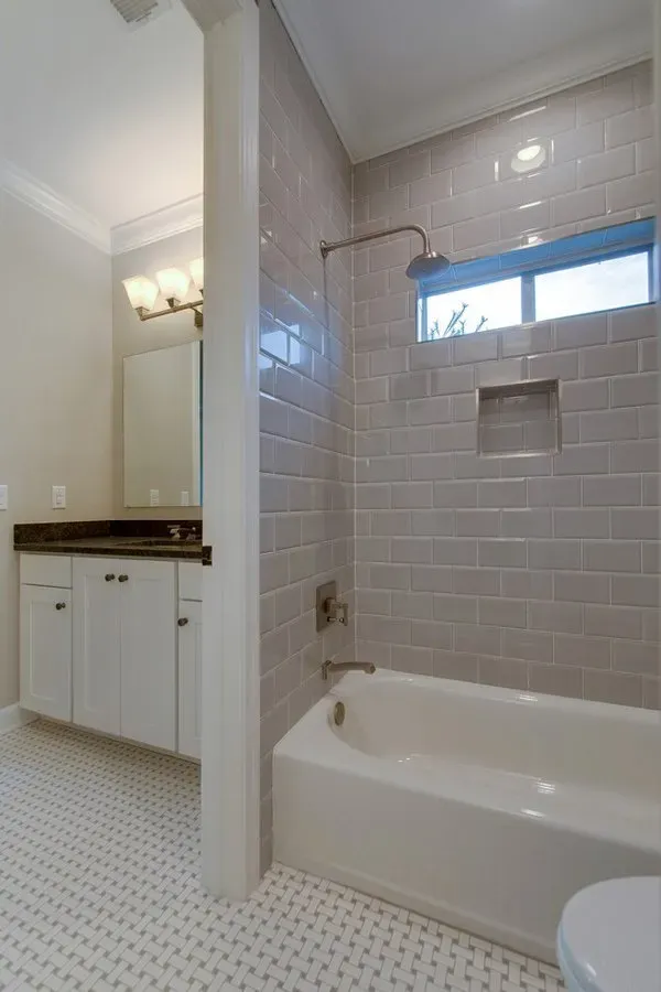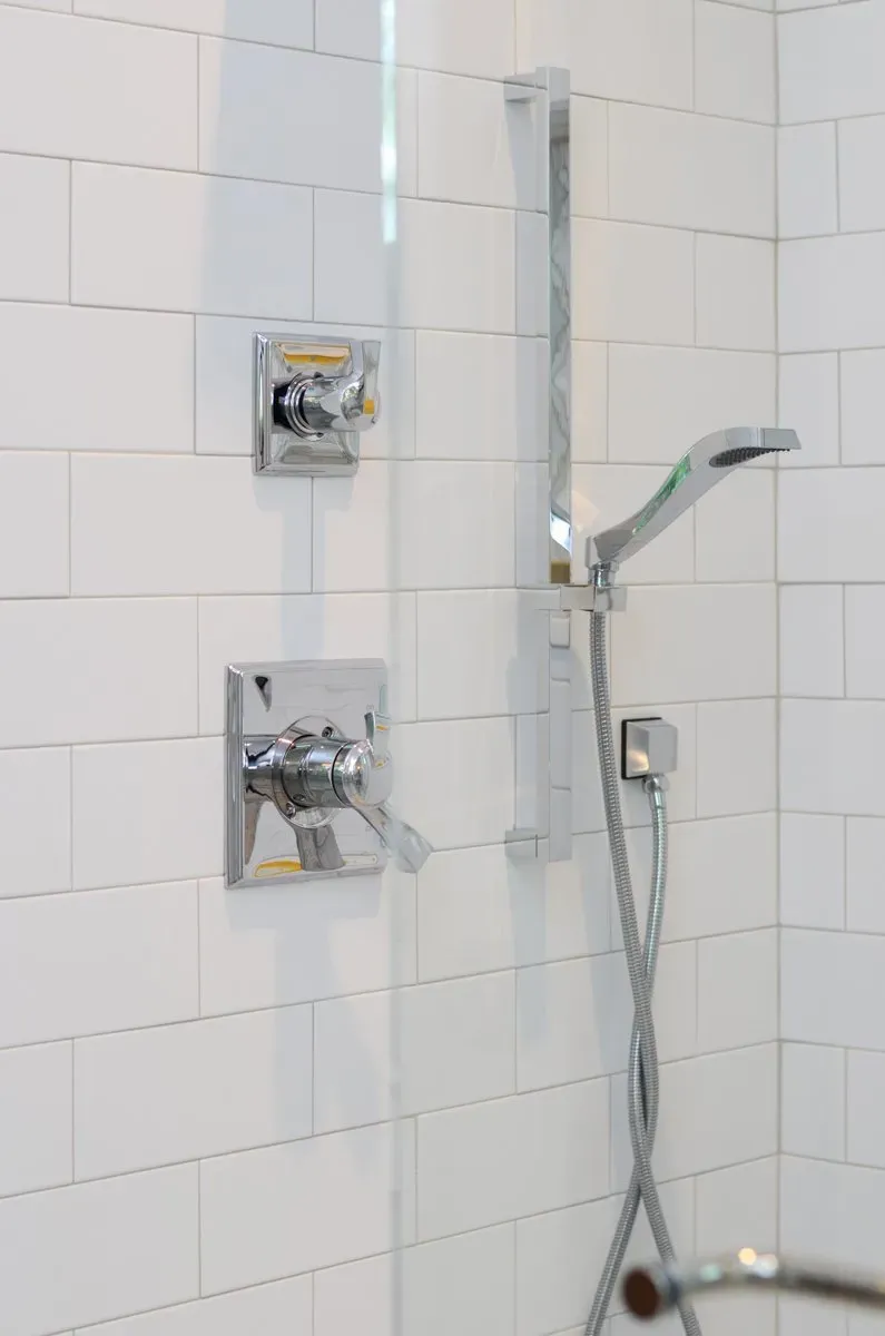 This bathroom features a freestanding tub, bubble chandelier, stainless steel shower fixtures, and subway shower tile. The mudroom features brick floors and custom cabinetry.