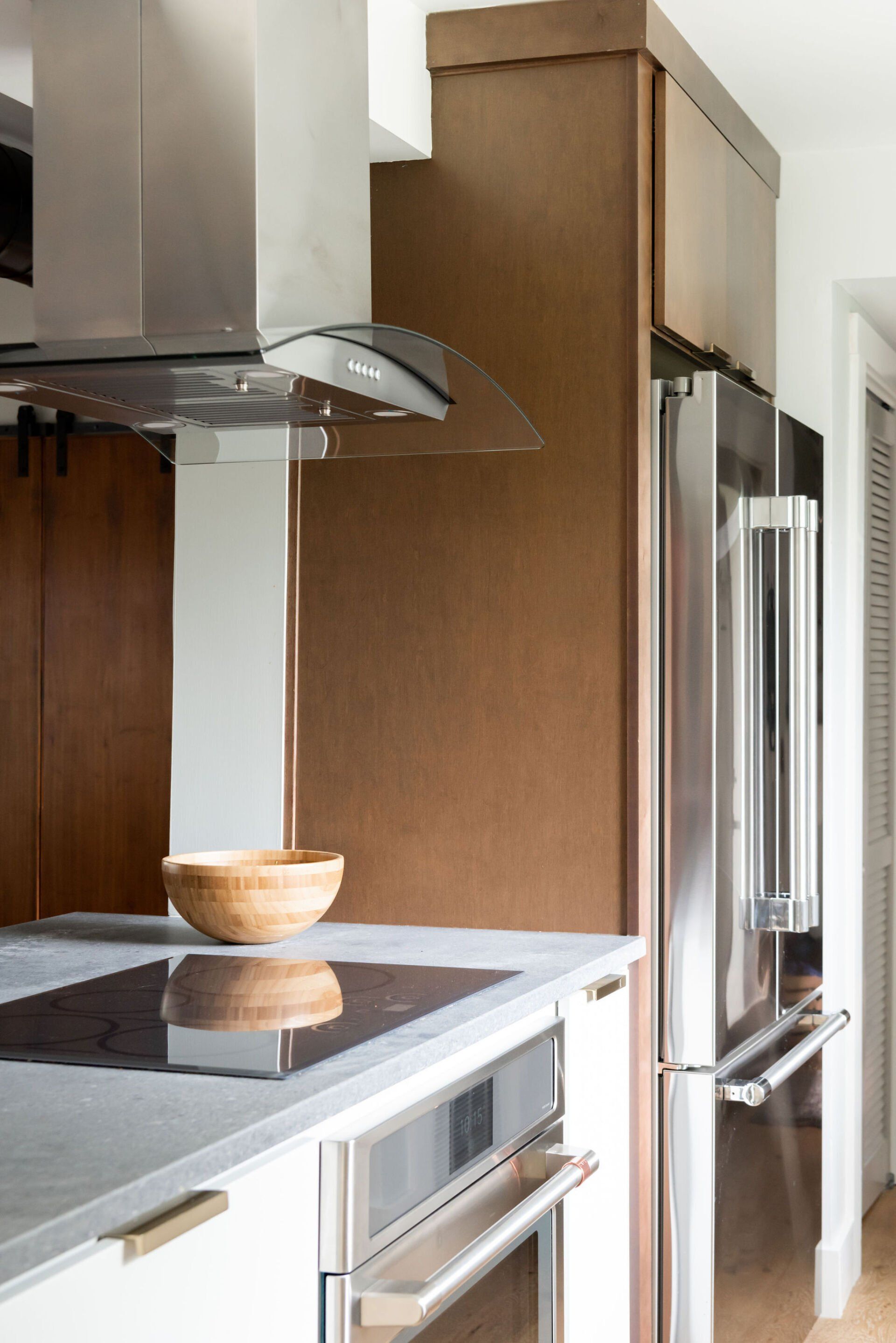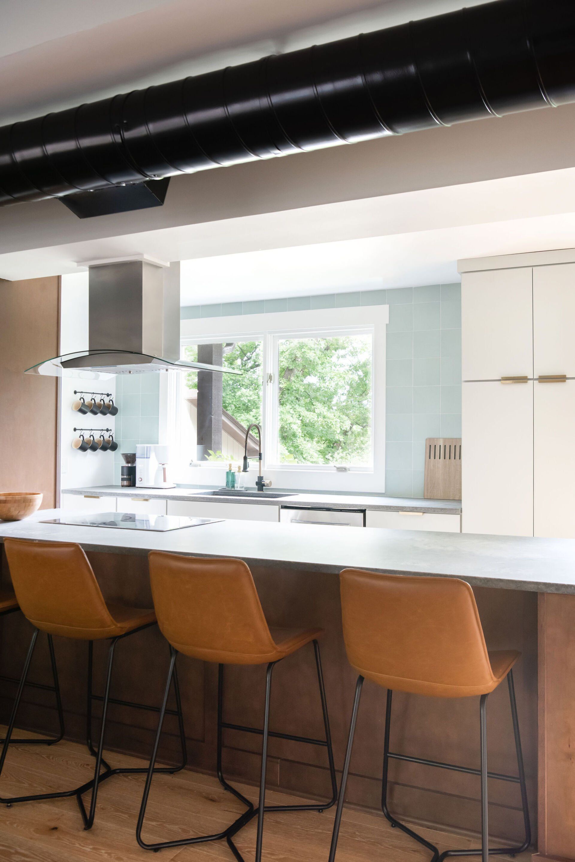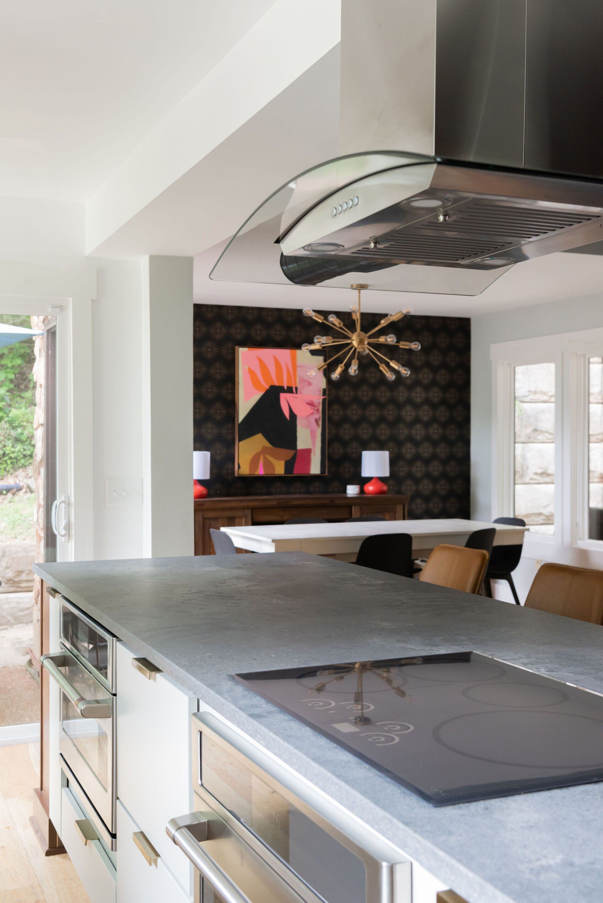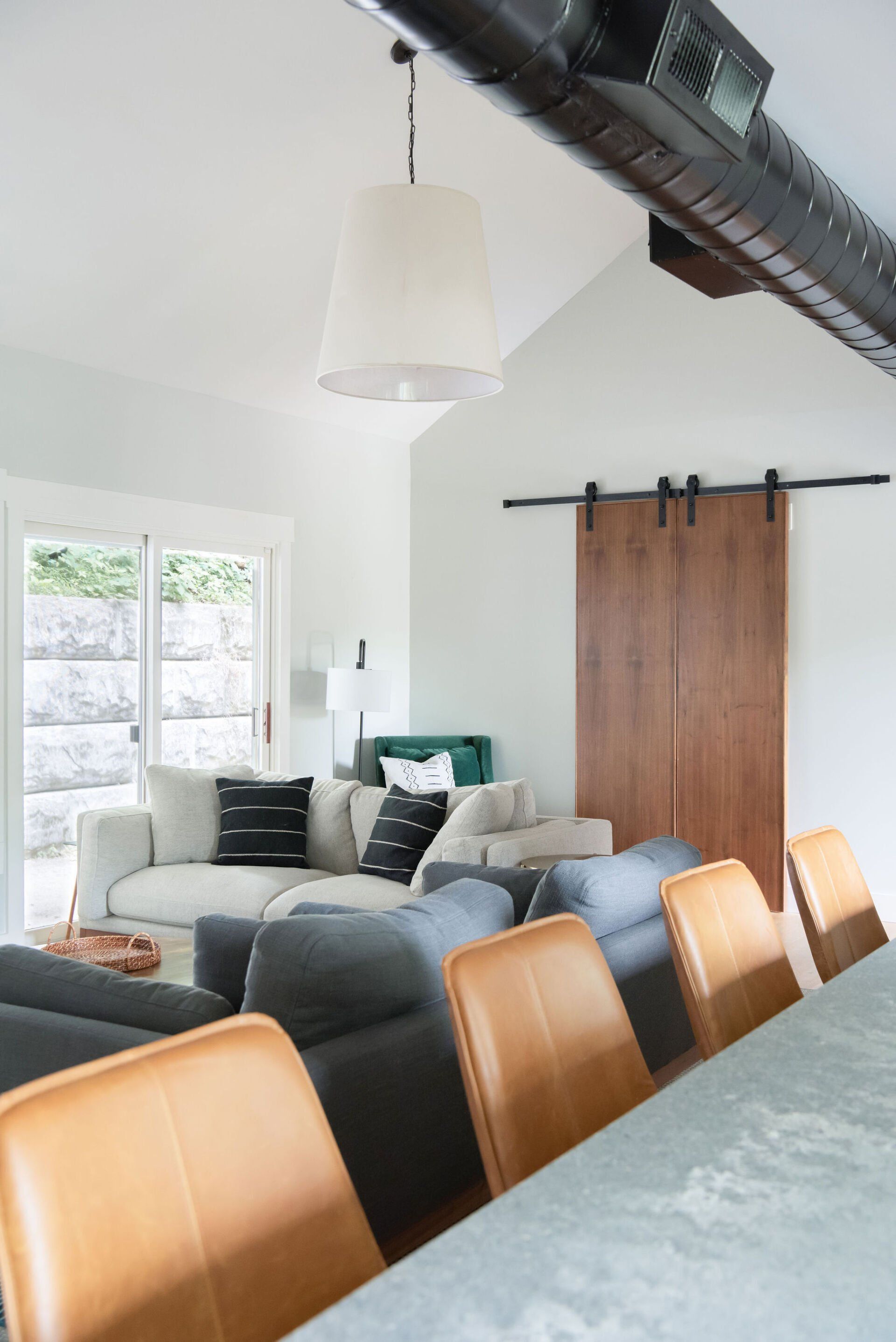 This remodel features a custom sliding barn door in the living room, a modern kitchen, and unique wallpaper in the dining room.