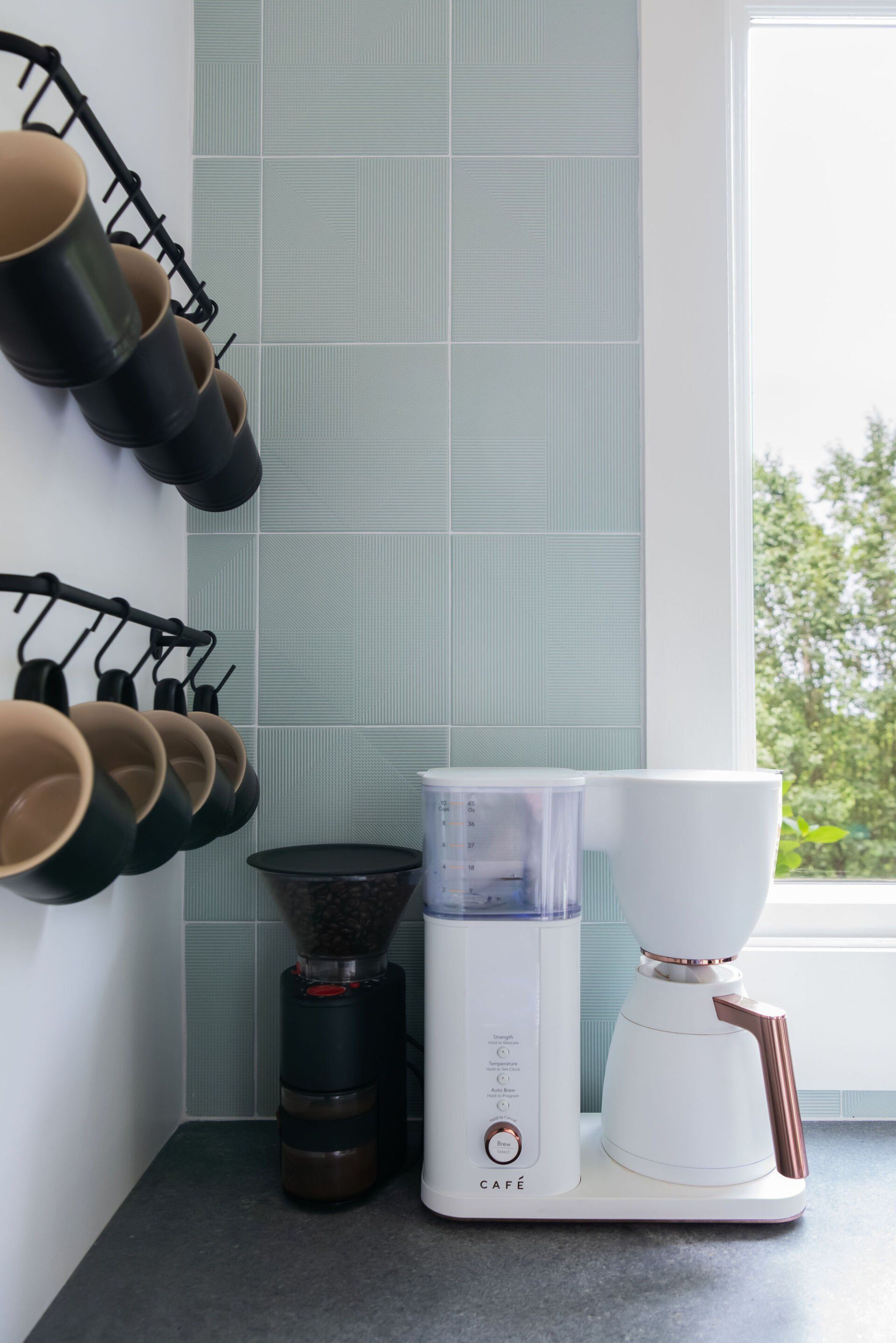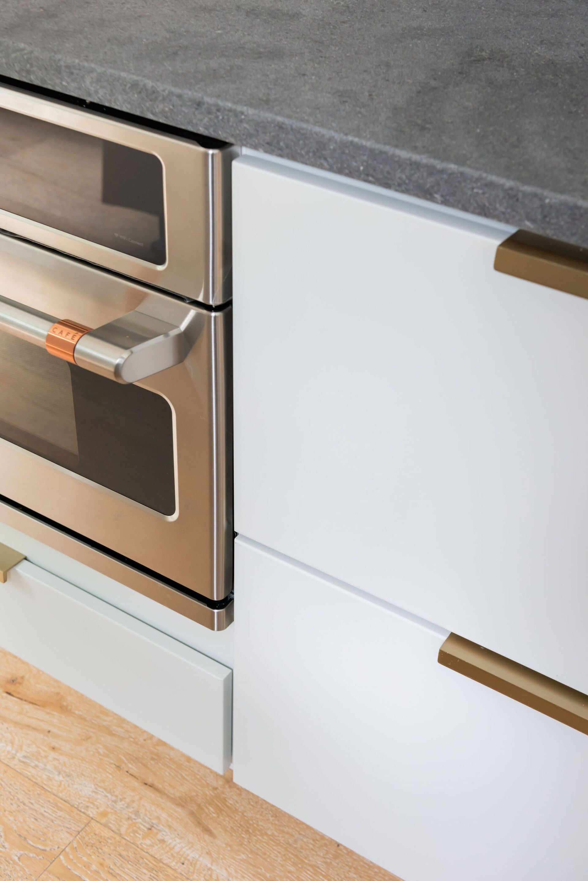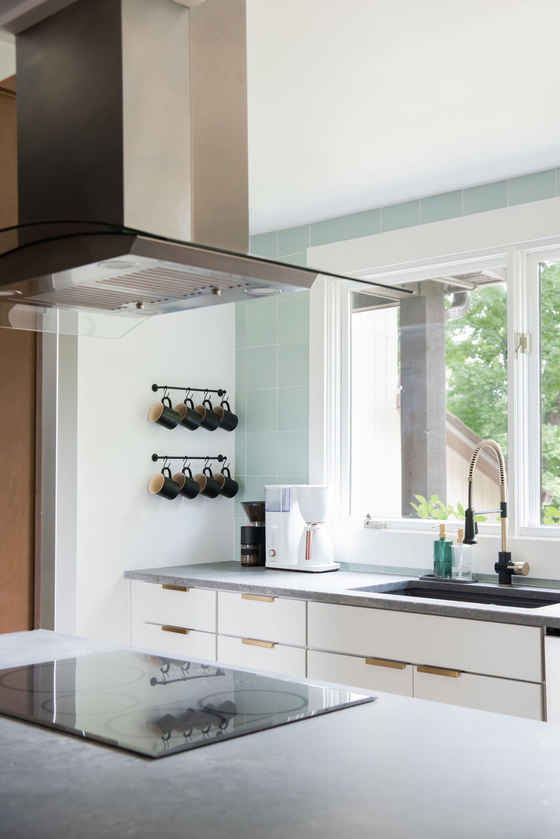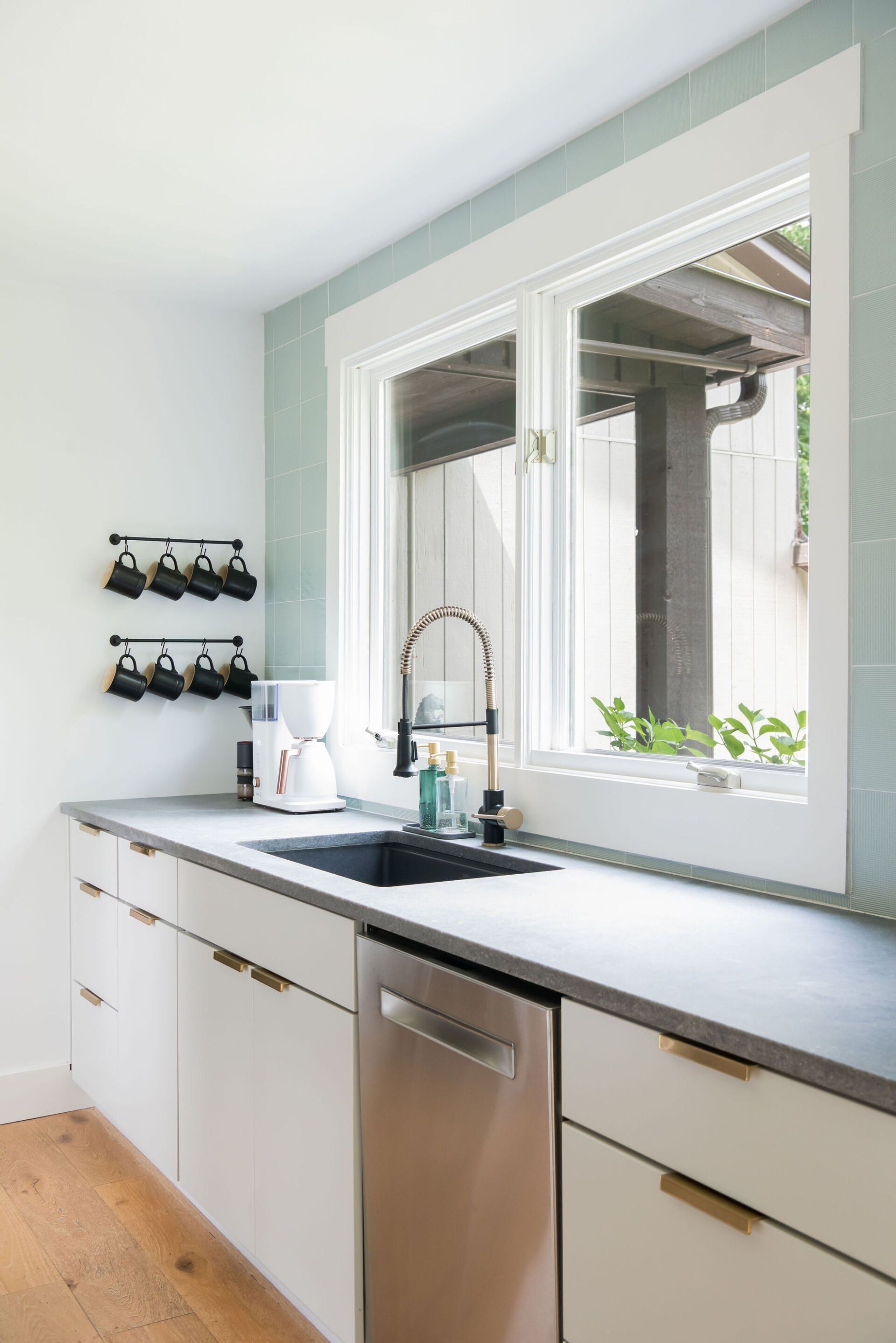 This remodel features a custom sliding barn door in the living room, a modern kitchen, and unique wallpaper in the dining room.